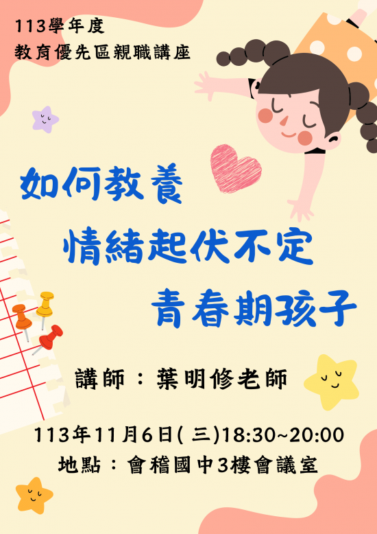 | (一) 時間:113年11月6日(星期三)晚上18:30~20:00 。 (二) 地點:會稽國中 三樓會議室。 |