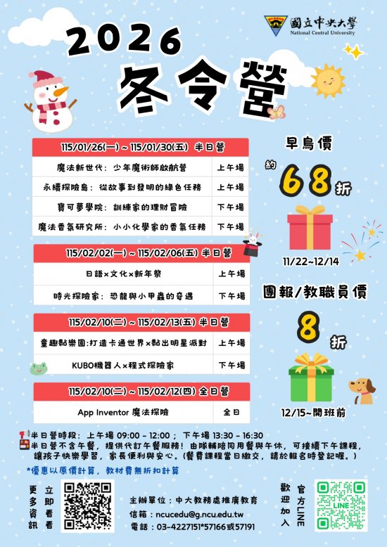 | 一、 | 為豐富國小學童之寒假活動,並提供多元優質學習內容,推出「2026 冬令營」,課程涵蓋科學、程式、藝文、永續、語言文化等主題,結合情境任務與創意實作,期能帶領學童在寒假期間持續探索學習的樂趣,提升多元能力與素養。 |